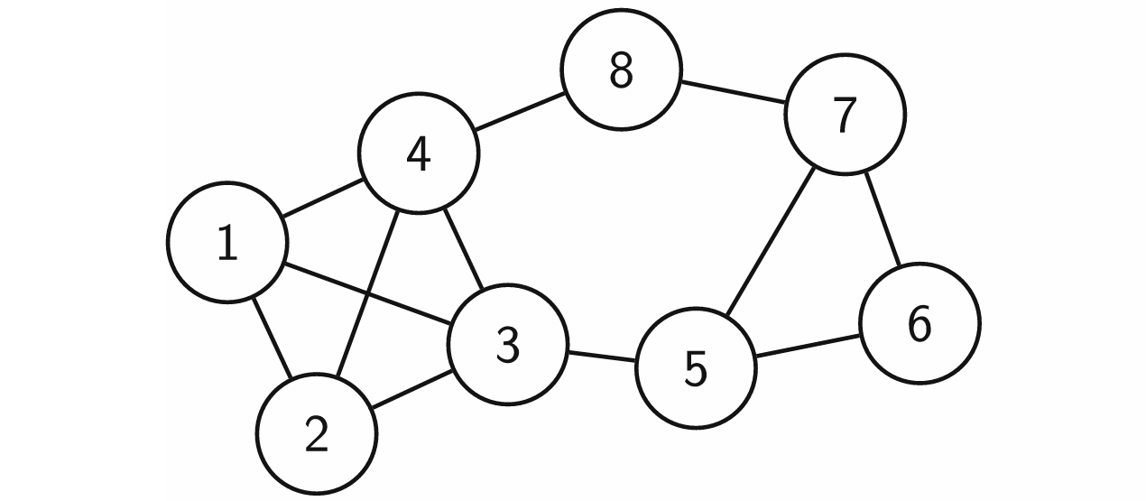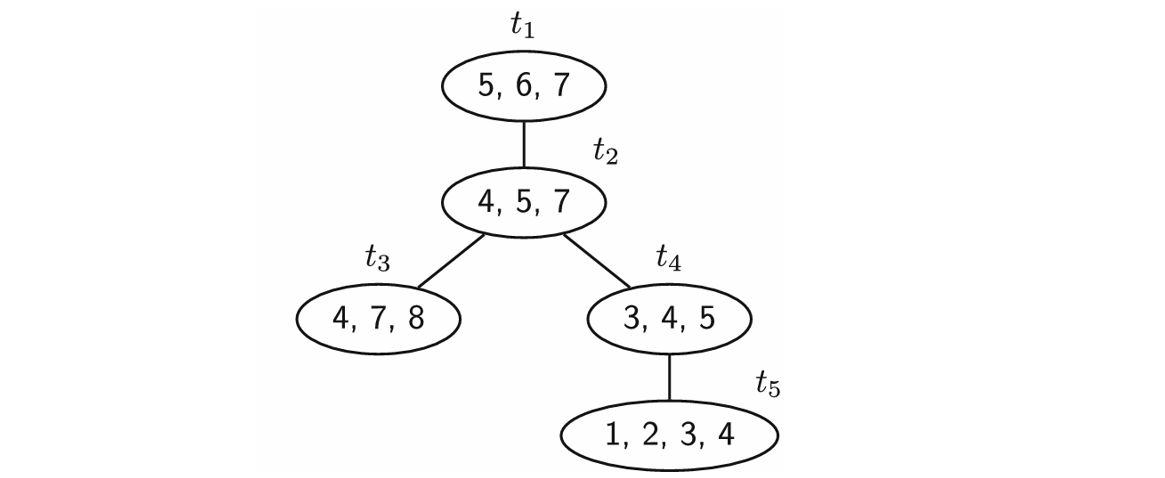 Before you can understand tree decompositions, you must know what a tree is. A tree is graph that does not contain any cycles. The graph in Fig. 1 is not a tree because it contains multiple cycles, one of which is the path from 5 to 6 to 7 and back to 5. The tree decomposition of a graph is a tree, in which each vertex represents a subset of the vertices of the graph, also called a bag. We call the vertices of this tree nodes to distinguish them from the vertices of the graph. An example of a tree decomposition is given in Fig. 3, in which the numbers inside the nodes represent the subset of vertices related to that node. For example, the bag of node \(t_3\) has vertices 4, 7 and 8. An important property of tree decompositions is the width, which equals the size of the largest bag minus 1. The tree decomposition below has a width of 3, because the largest bag in \(t_5\) contains 4 vertices.