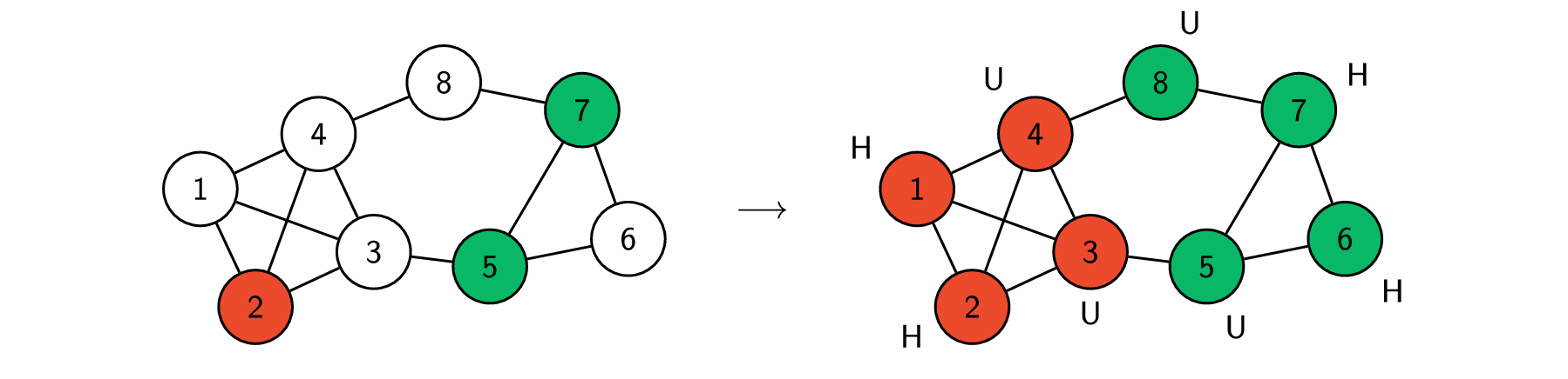 The maximum happy vertices problem considers graphs in which the vertices are coloured, and we say that a vertex is happy if it has the same colour as all its neighbours (i.e., the vertices it is connected to). For example, imagine you need to assign the seat arrangement on your wedding. The vertices could represent the invitees, the edges who are friends to each other, and the colour represents the table to which you assign the invitee. An invitee/vertex is happy if he sits together with many friends. Given a graph in which a small set of the vertices are coloured, the maximum happy vertices problem requires you to colour all the remaining vertices such that the number of happy vertices is maximised, such that the maximum number of invitees at your wedding is happy with their seat. An example is given below.