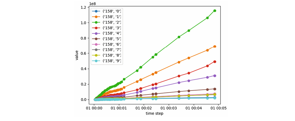 The operational readouts measure several parameters while the truck is driving. To limit storage requirements, experts defined a number of intervals in which the parameters can fall. For example, a temperature could be smaller than 20°C, between 20°C and 25°C, between 25°C and 30°C, or larger than 30°C. For each interval, a counter counts how often a measurement is taken in each interval. The operational readouts are then snapshots of these counters at irregular time intervals. In total there are 14 anonymized parameters with a variable number of intervals. An example of these readouts for a single truck is given below.