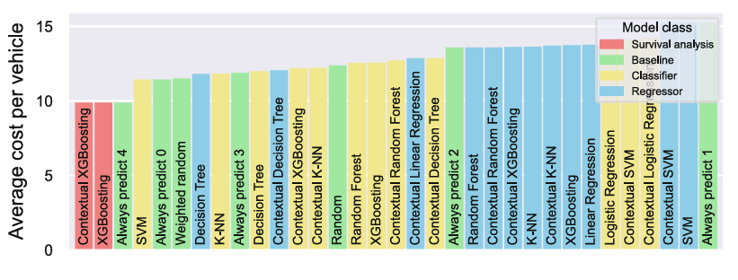To quantify whether the models generalize properly to unseen data, we also include a number of baselines. “Always predict X” will constantly predict label X, independent of the data. Then, we also include “Random” which selects a label uniformly at random. Similarly, “Weighted random” also samples a random class label, but weighted by the number of time each label occurs in the test data. For both random baselines, we average the total cost of 100 predictions to reduce the variance.